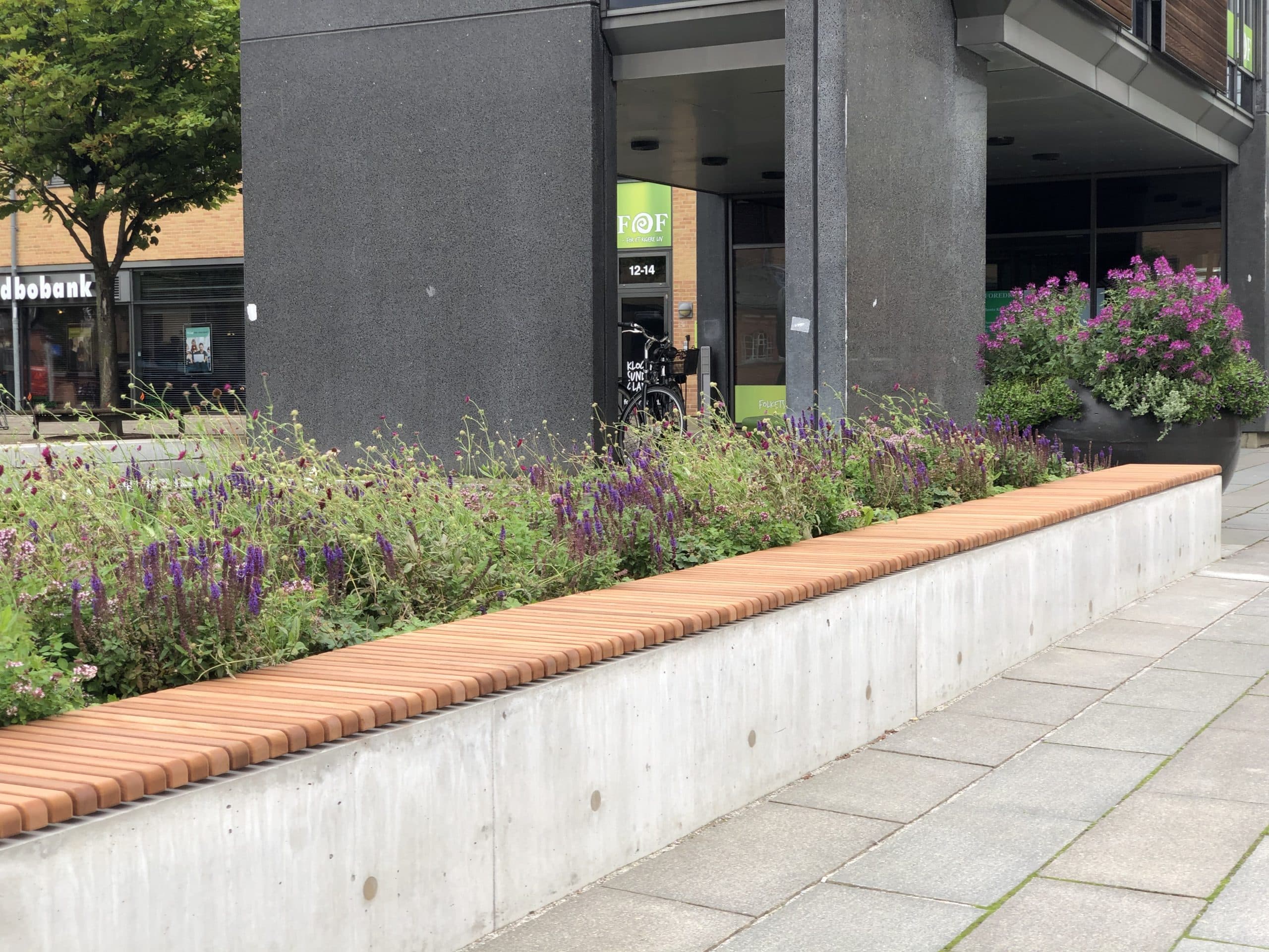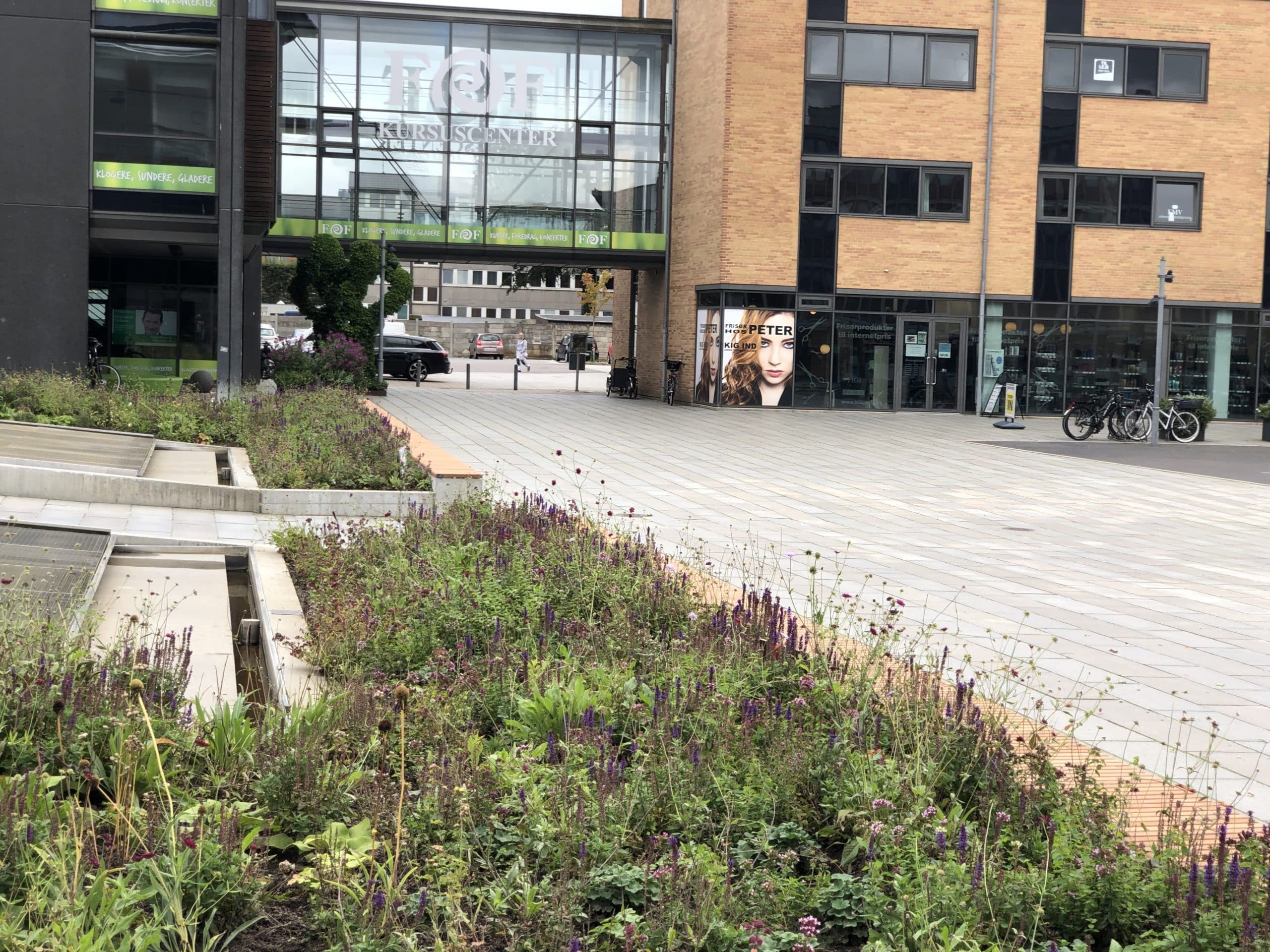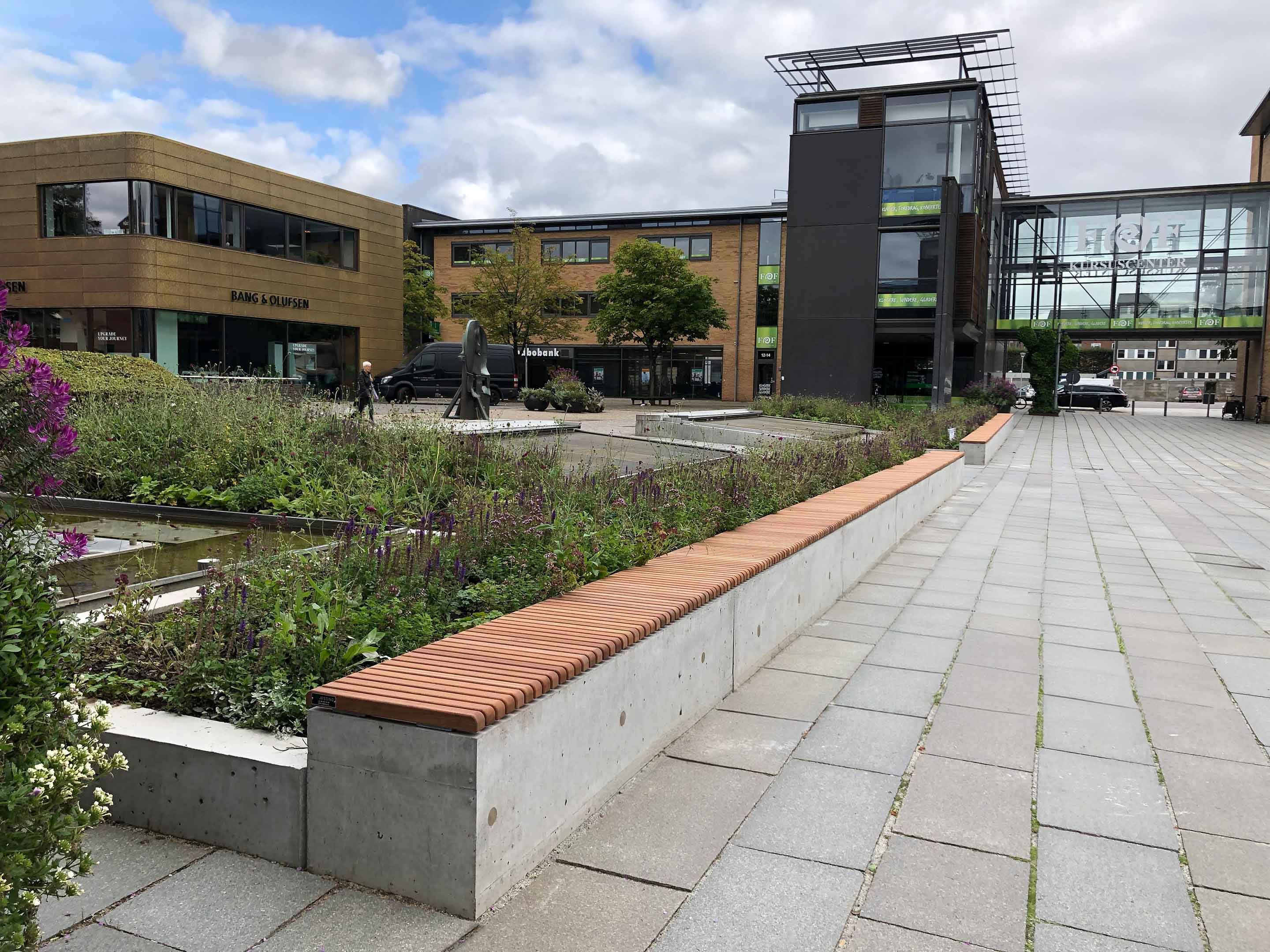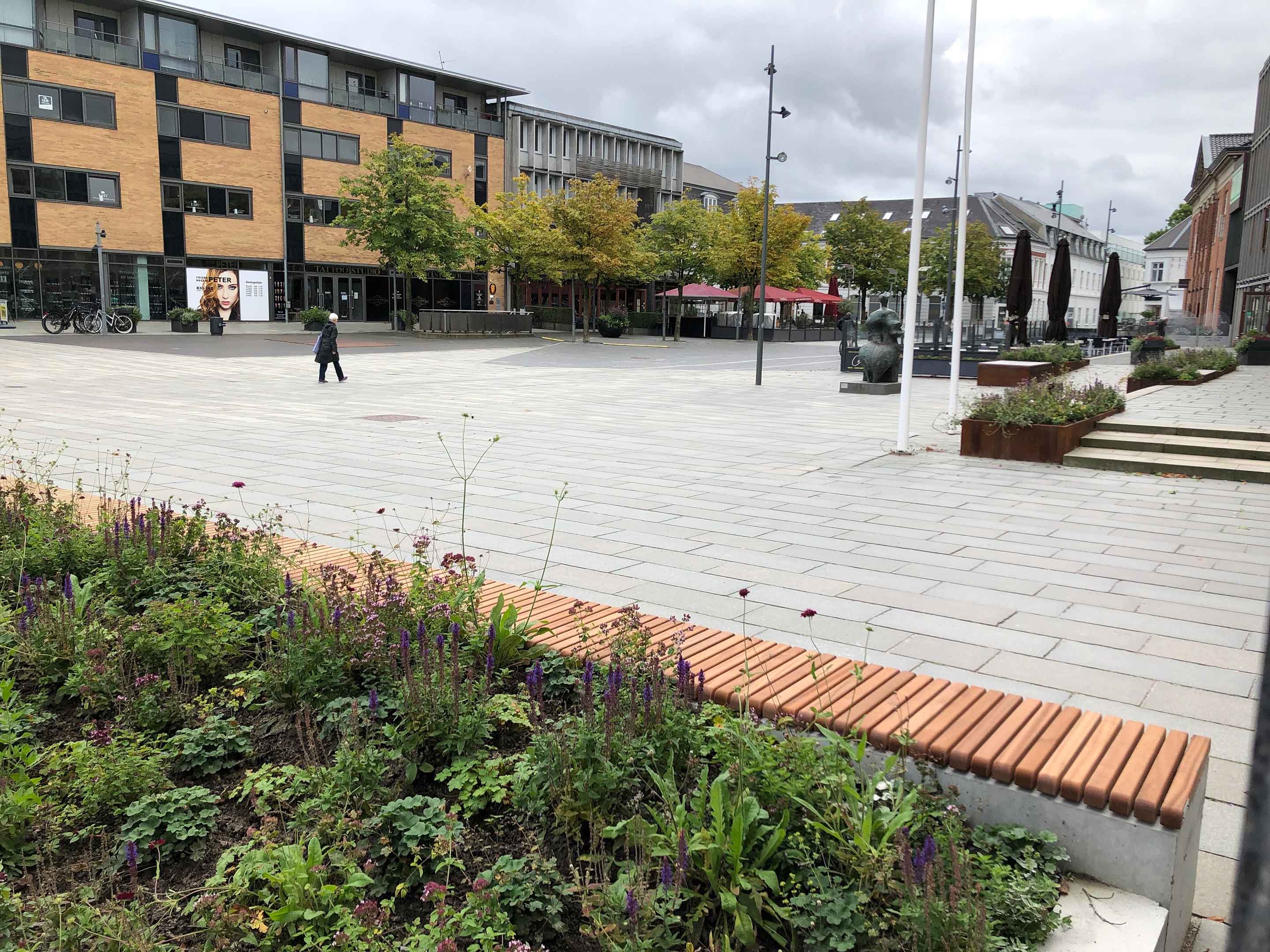 I 2019 lavede Herning Kommune et nyt tiltag, for at fremme farve og liv i byrummet. På denne placering blev det eksisterende springvand beriget med blomstrende, længelevende og insektvenlige beplantninger, som netop vil give dette året rundt. Blomsterne og planterne er sunde danske planter, som er særligt udvalgt til at kunne modstå det danske klima.